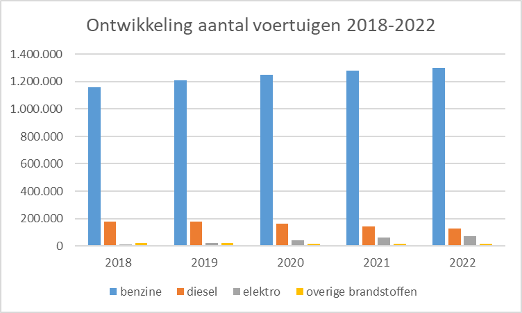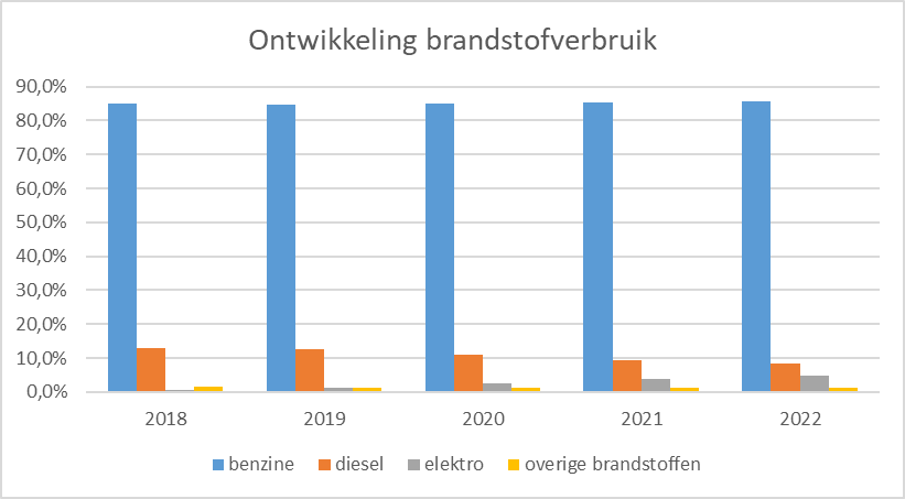 Uit bovenstaande tabel blijkt dat het aantal van benzine voertuigen nagenoeg gelijk blijft. De diesel voertuigen laten een lichte daling zien de afgelopen jaren. Het aandeel van electrische voertuigen neemt daarentegen toe. Ultimo 2022 bedroeg het aandeel van benzine voertuigen 86% van het gehele voertuigenpart. Voor diesel was dat 8%, voor electrische voertuigen was dat 5% en de overige categorie was 1% van het totaal.