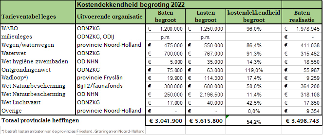 Provincies hebben een aantal taken ter zake waarvan individuele diensten worden afgenomen door bewoners of bedrijven. Aan de afnemers van deze diensten worden leges in rekening gebracht ter bekostiging van de aan deze diensten gerelateerde kosten (zoals personeels-, huisvestings- en materiaalkosten). In de tarieventabel behorende bij de legesverordening zijn voor de provincie Noord-Holland tarieven opgenomen voor onder andere het afgeven van vergunningen in het kader van de fysieke leefomgeving (Wet wabo), Waterwet, Wet natuurbescherming en Wegenwet. In december 2019 is door Provinciale Staten besloten dat de leges kostendekkend dienen te zijn.