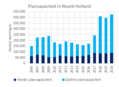 De provincie inventariseert periodiek het aantal woningen dat gemeenten in bouwplannen hebben via de website www.plancapaciteit.nl. De grafiek toont het aantal harde plannen (locaties met een vastgesteld bestemmingsplan) en zachte plannen (locaties die in voorbereiding of potentieel zijn).