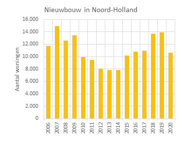 De grafiek toont het aantal opgeleverde nieuwbouwwoningen per jaar in Noord-Holland.