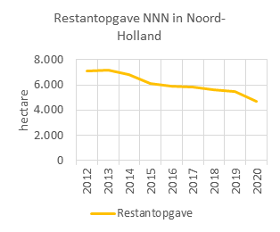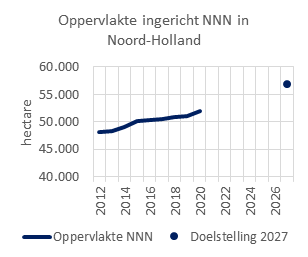 Deze indicator geeft respectievelijk het totale oppervlakte ingerichte NNN en de restantopgave van de in te richten NN weer in het aantal hectare. De streefwaarde is een oppervlakte van 56.700 hectare NNN in 2027.