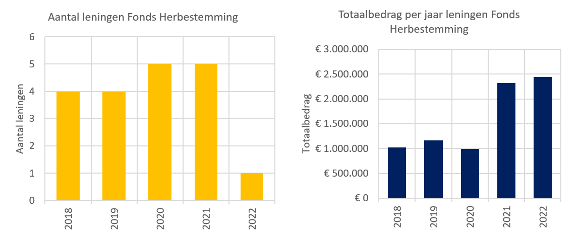 Het aantal leningen en het totaalbedrag van deze leningen verleend vanuit het Fonds Herbestemming.